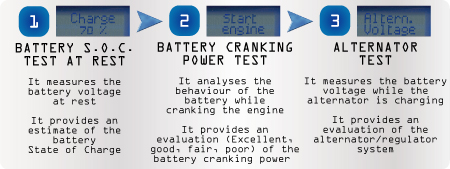 Battery Test at rest, Battery Cranking Test & Alternator Test.